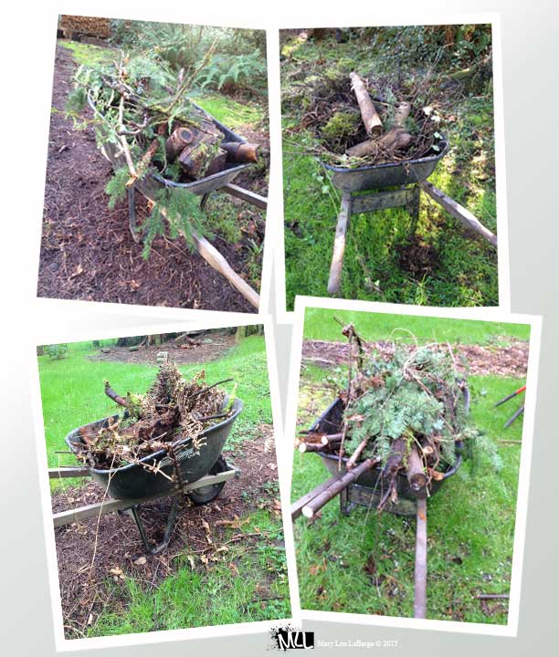 As I unearthed a far corner of our land, I started thinking about taking photos of each wheelbarrow load of debris. Has anyone done it? Would these photos be as exciting as watching ice melt or could they be assembled and viewed as art? Could photos of clearing land featuring the lowly wheelbarrow be elevated to artistic compositions worthy of a gallery show? Are they interesting or yawners? So many questions without any answers. Each week during late winter through spring, I fill a 300 gallon can with forest debris caused by the fall and winter wild Pacific Northwest storms. Cleaning our land requires a good deal of walking up and down a gradual incline through a forest and finally making my way out to the side of the road to lift and toss branches and other woodland debris into a three hundred gallon can. When I stand next to that huge can, I feel like an elf standing next to a Sasquatch. Today I tested the wheelbarrow photography concept just because I needed to keep the land clearing experience interesting. Using a smartphone, I snapped a picture each time I filled the wheelbarrow taking care to move the angle of the wheelbarrow and change the background to vary the shot. I wondered, would a viewer in a gallery be intrigued or bored? Knowing what an art connoisseur is going to feel is usually a crap shoot. Maybe the wheelbarrow images could be art, however, I am thinking the photos lean more towards documenting progress on maintaining an overgrown forest that needed owners who care and love tending land.
